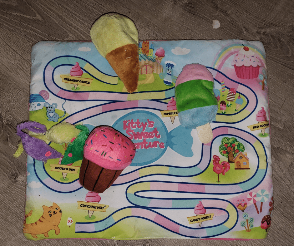 This months toy was a board-game “Kitty’s Sweet Adventure”. The kitties travel through a sweet-land. The mice are the playing pieces. It reminds me of a game I played as a kid- I’m sure you know which one I am talking about!